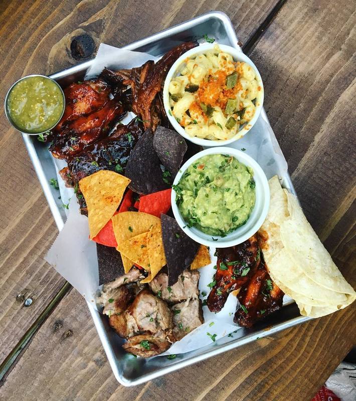 Butcher Platter (carnitas, brisket, wings, rib tips, guac and poblano mac)